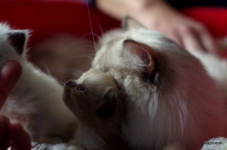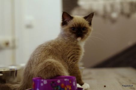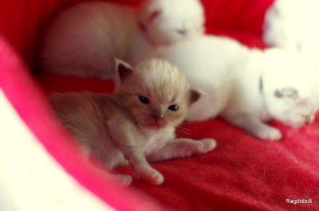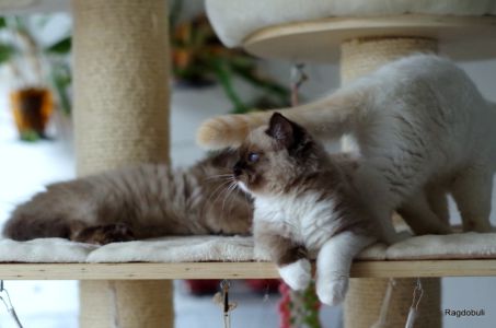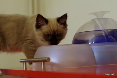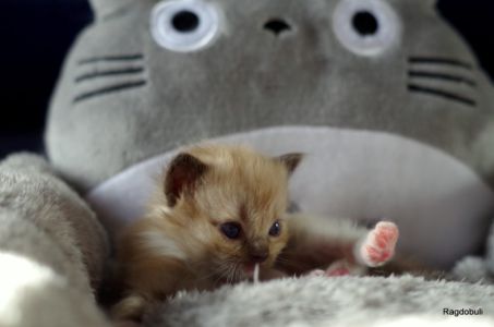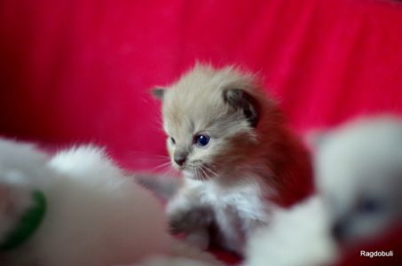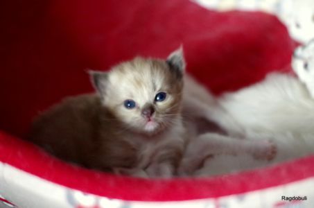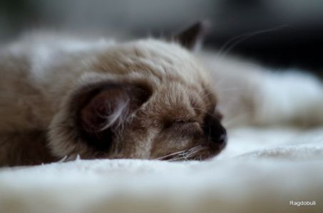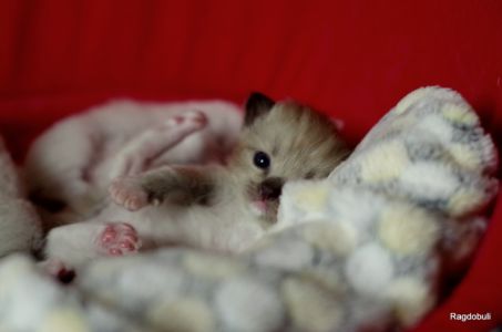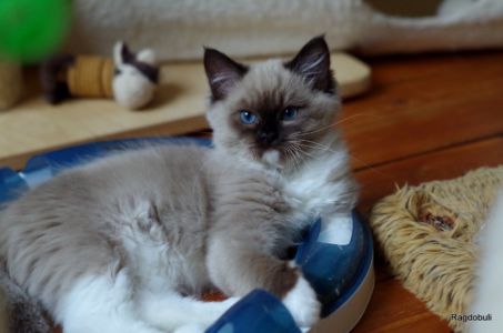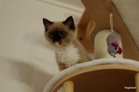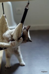 En apparence c’est certain, il a de beaux yeux bleus pour un Ragdoll mink, à l’image de son papa Lothaire, et il est rigolo car son défaut lui donne les traits d’un chaton tout-terrain, un vrai 4X4 … il a une soquette d’été et une chaussette laineuse d’hiver, c’est tordant !