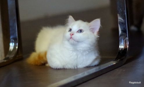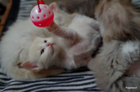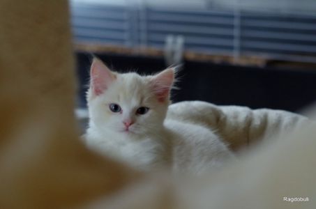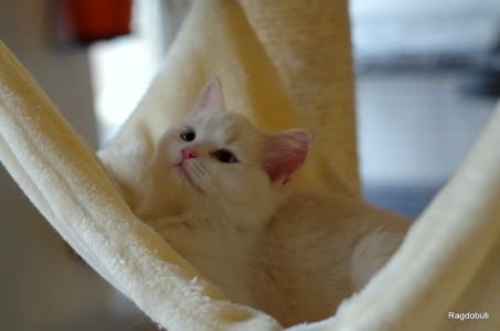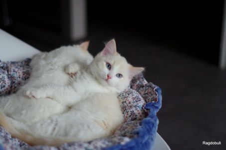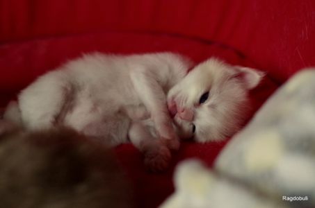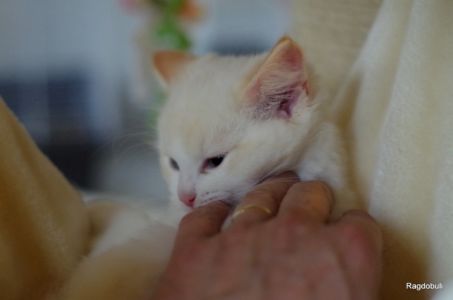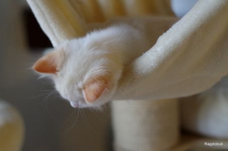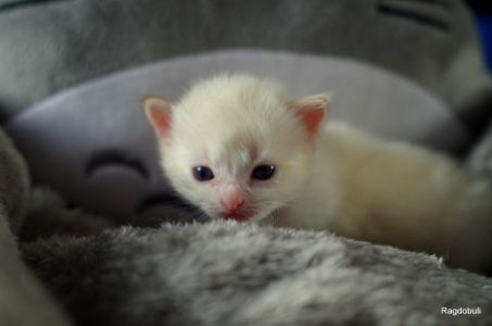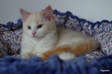 Lui aussi a malheureusement perdu un peu de poils suite à l’incident gastrique qui a touché la portée de Fatina, mais on peut dire sans hésiter qu’il aura la pilosité approximative d’une Napée ou d’une Nell, toutes deux étant des Ragdoll mink.