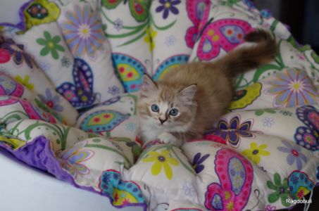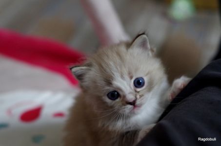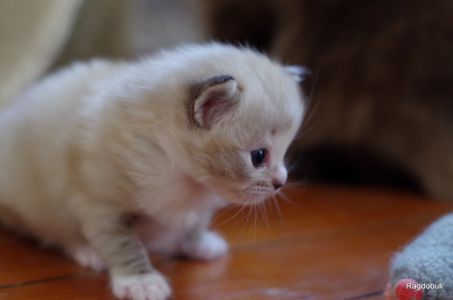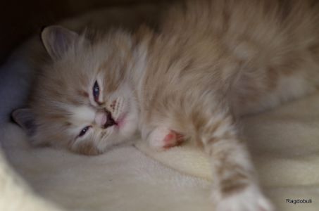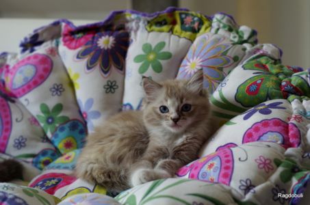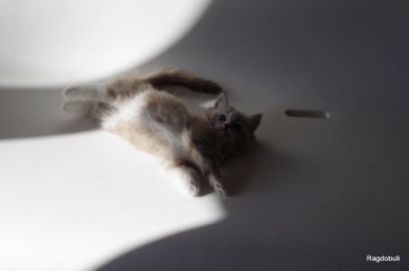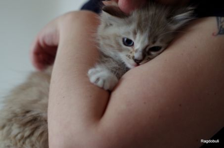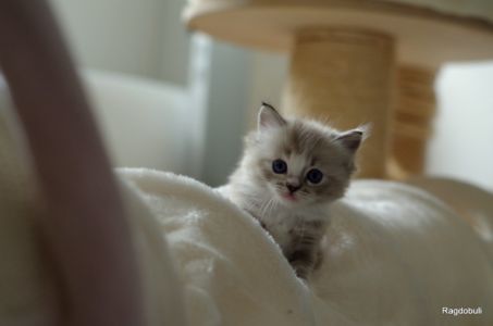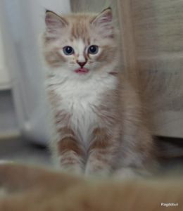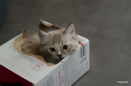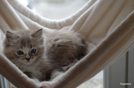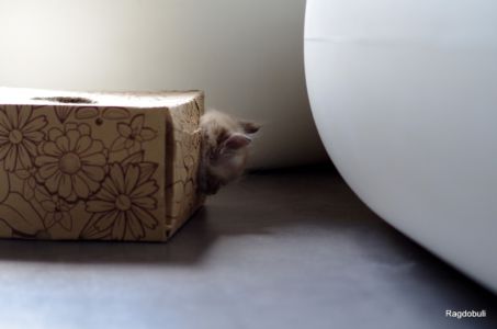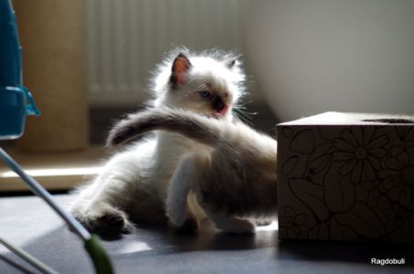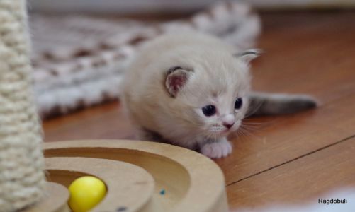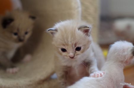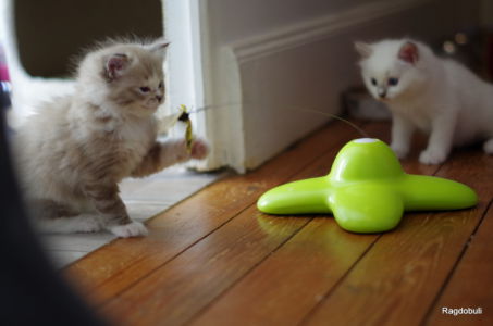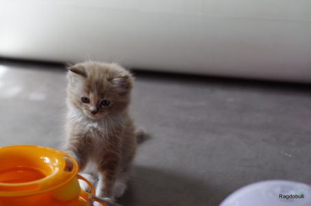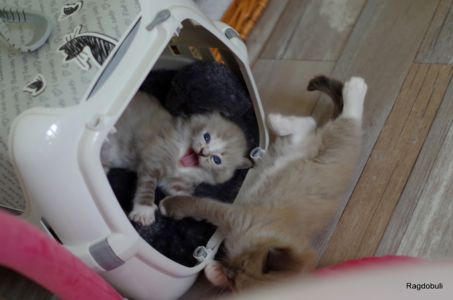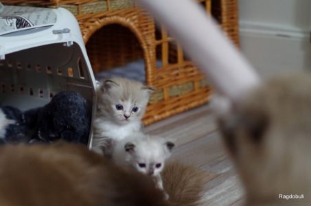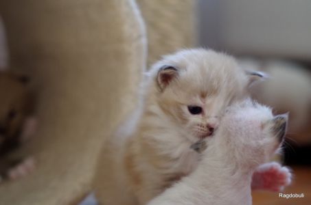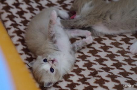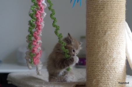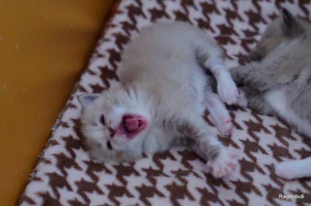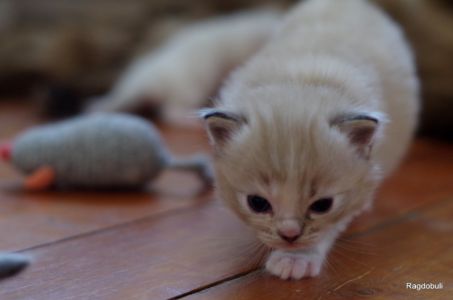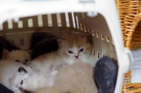 A 6-7 semaines, elle demeure la même petite souris espiègle, la grande suiveuse de son frangin Prosper ! Fi-fille oblige, elle garde une certaine retenue dans un environnement qui s’élargit de jour en jour, elle développe une sensibilité et une timidité relative qu’on ne lui connaissait pas … nous verrons bien son comportement une fois que son espace de vie sera définitivement borné et que la maison toute entière sera à elle !