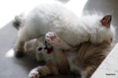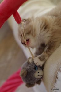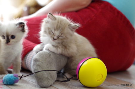 A 8 semaines passées, Praline lâche un peu son côté « garçon manqué » qu’elle faisait valoir au contact de son frère Prosper, elle réclame davantage de câlins mais demeure toujours aussi joueuse !