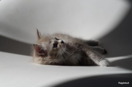 Il fallait bien trouver un nom qui résume l’universalité de ce que l’on aime, la praline en est l’essence et notre Praline est tout aussi aimable ! Elle est Miss détente et plutôt séductrice, elle utilise son bidon pour nous appâter et l’on mord à chaque fois … en quelque sorte il suffit de la regarder et hop ! elle se met sur le dos et présente naïvement son petit ventre tout doux et tout chaud qui ferait fondre la praline elle-même […] Toutefois, sa candeur apparente est mise en relief par une témérité et une vivacité aussi élevée que son frère Prosper ; elle aussi est débrouillarde, plutôt joueuse et pas la dernière à la bagarre … nous attendons donc de voir ce qu’il se passera dans les semaines à venir. Ah oui ! j’allais oublier, Praline est particulièrement photogénique …