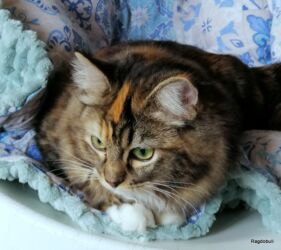 Tia est une fille plutôt discrète mais qui a un caractère certain. S’il y a une embrouille, elle est du genre à rentrer dans le lard avant que l’autre n’en ait conscience et puis si un nouvel arrivant la toise, elle lui montre tout de suite qu’il ne faut pas la chatouiller.. outre cet aspect relationnel somme toute fréquent dans le monde des félins, Tia aspire à une certaine quiétude, une paix intérieure qui peut être effective que dans un environnement stable, calme et serein.