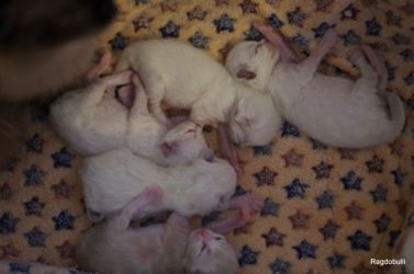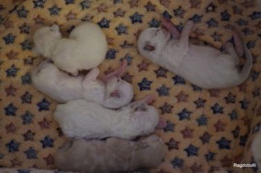 Poupette a mis au monde 6 belles petites boules de poils ; elle a fait son travail en deux temps, de 21 heures à 23 heures et de 1 heure à 3 heures du matin. Elle n’a pas démérité pour une première fois mais malheureusement, 3 jours après la mise bas, Poupette qui était assez stressée et fatiguée, a dû s’endormir profondément et étouffer un de ses petits … la nature est cruelle, Poupette a eu des difficultés à se poser, à prendre conscience qu’elle est maman et les premiers jours furent une épreuve pour nous tous. Aujourd’hui tout est rentré dans l’ordre, Poupette n’est pas mère-poule pour autant mais elle fait son devoir et l’on voit grandir ses chéris.