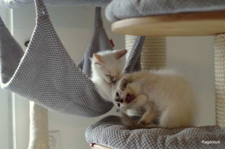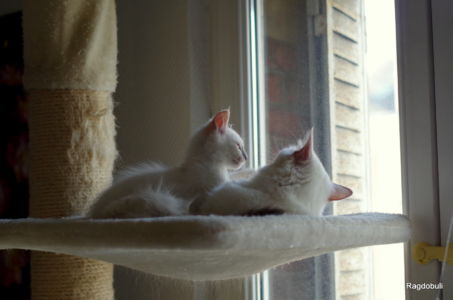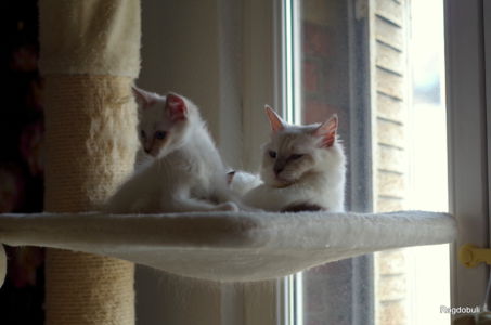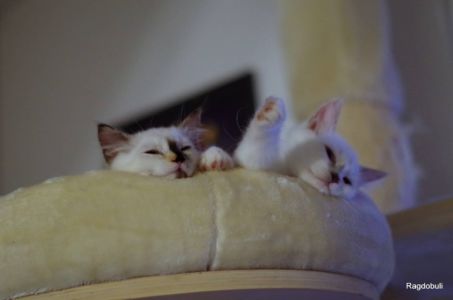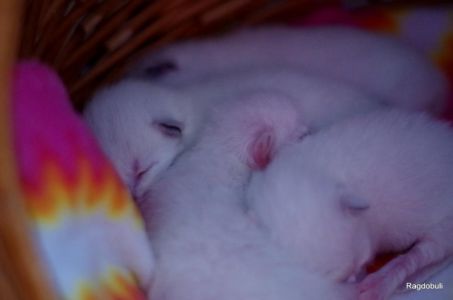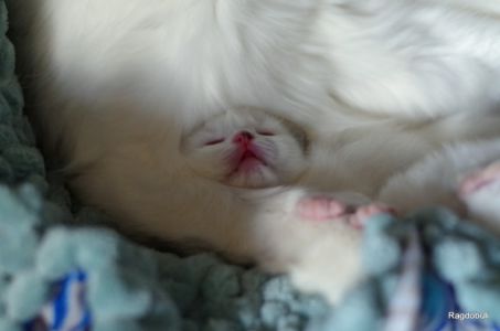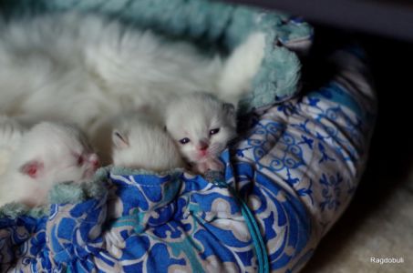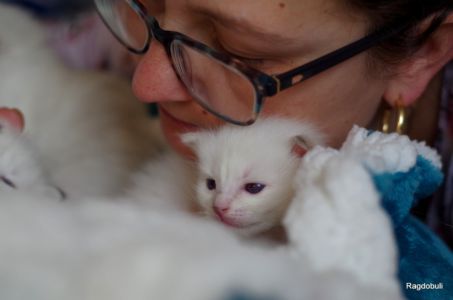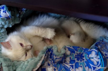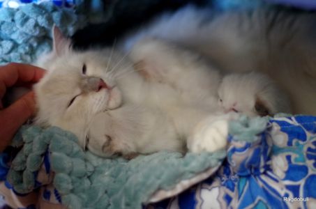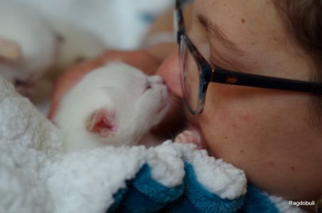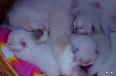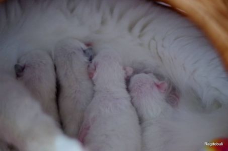 Les bébés de Gaïa et de Mérovée ont 1 semaine ! Malheureusement nous avons perdu un petit qui n’a pas survécu à sa deuxième nuit, suite à une légère blessure occasionnée lors de la mise bas et qui s’est infectée par la suite … les quatre autres petits se portent à merveille, ils ont plus que doublé leur poids … c’est un réconfort pour tout le monde, et même maman Gaïa a déménagé ses chatons, un peu comme si elle voulait nous arracher à ce souvenir endeuillé et entériner le fait que la nature est parfois cruelle. Elle est très fière de ses bébés, elle nous réveille tout le temps pour nous montrer qu’elle fait bien son travail et nous la félicitons à chaque fois, les yeux dans les yeux et la main dans la patte, pour l’encourager dans ce sens !