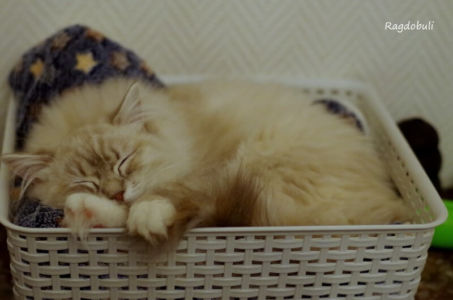 Elle est d’une rare douceur, c’est un ange ! Dès que l’on s’assoit, elle vient doucement nous pétrir et parfois elle se met à téter nos vêtements en ronronnant comme un bébé ! Elle est docile et adore jouer avec ses petits camarades, elle exige aussi notre présence permanente … si on a le malheur de faire une petite course, c’est la fin du monde et elle boude … heureusement qu’elle n’est pas rancunière !