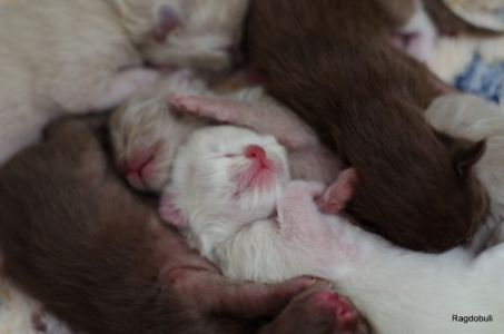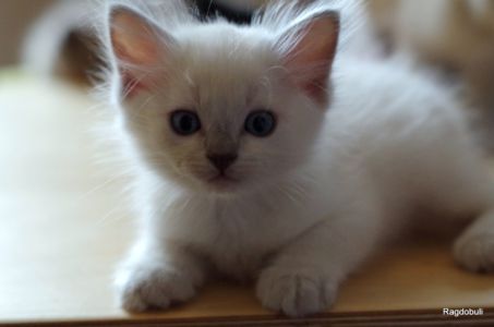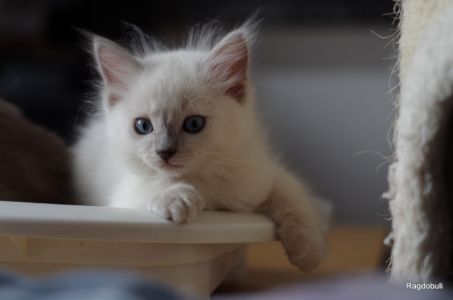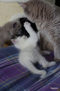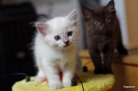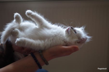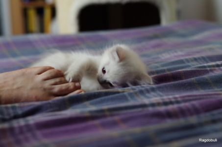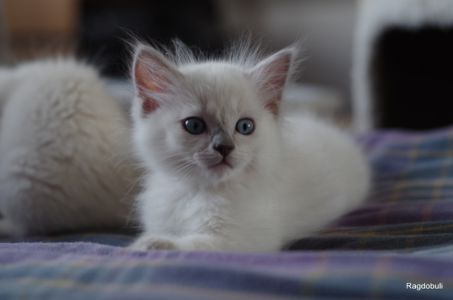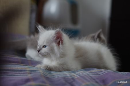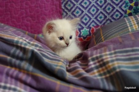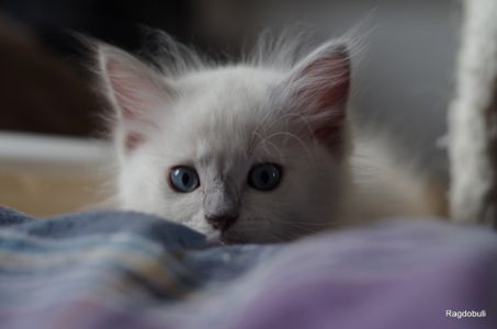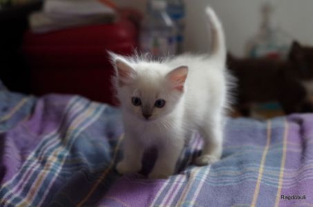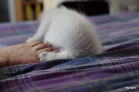 Roulé-Boulé est un phénomène ; depuis le début il roule sa bosse, il roule sa caisse, il est un cascadeur né ! Tout est prétexte à se rouler par terre, de gauche à droite, de haut en bas et il adore s’incarner en tape-taupe : nichée dans nos draps sa petite tête de fripouille jaillit puis se cache à tout va … Roulé-Boulé est un électron libre, un joyeux drille qui ne se fait pas prier pour nous taquiner mais dès lors qu’il se calme il « roule-boule » sur nous comme s’il souhaitait se faire pardonner de nous tourmenter ainsi.