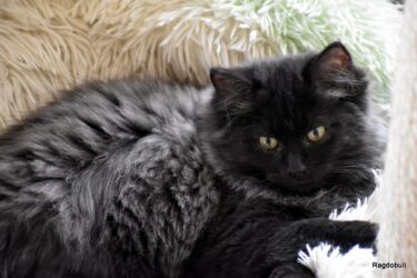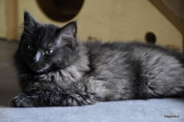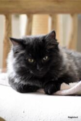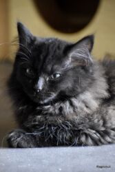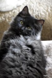 Ugo en impose et c’est un fait ; il est le plus gros de la fratrie alors il en profite.. De bagarre en bagarre il chemine, chevaleresque, et domine tout un pays. Il est tel un ours dont la noirceur, chamarrée de multiples reflets argentés, confère un aspect digne des grands prédateurs. Il est costaud, bagarreur mais il faut dire qu’il a au fond le caractère propre à toute la tribu, entendu la propension démesurée aux papouilles et autres câlins ; il est un peu à l’image d’une glace à l’eau à la réglisse que l’on aurait oublié sur la plage arrière d’une auto aux vitres cristallines, un après midi d’été caniculaire.