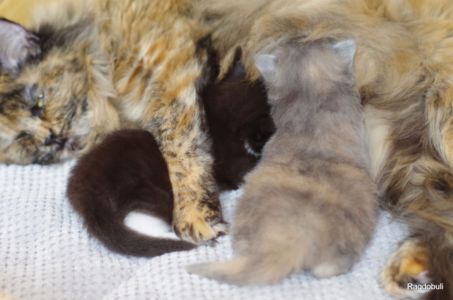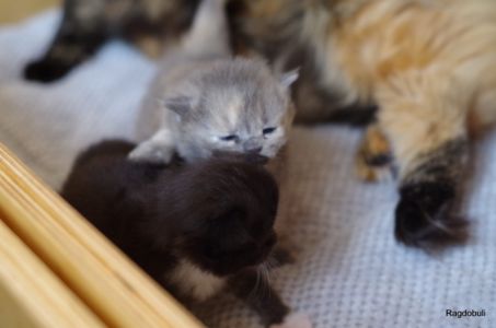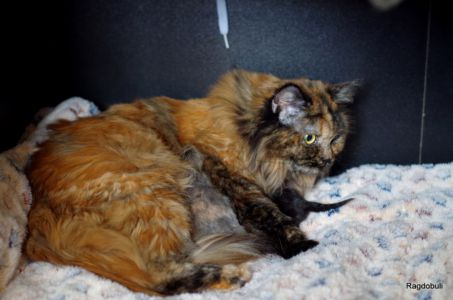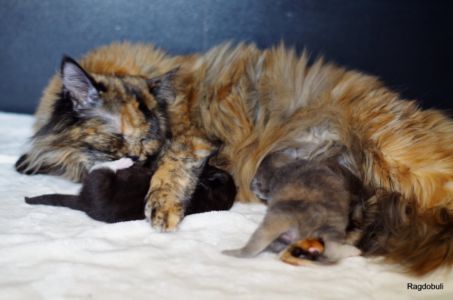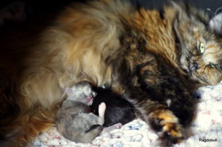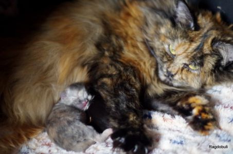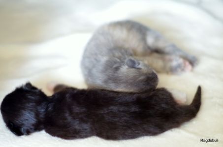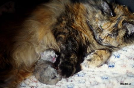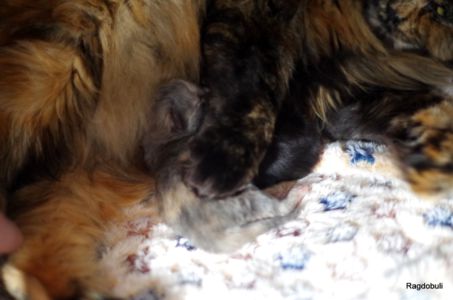 Perlinette ne put faire les choses simplement, peut être souhaitait-elle marquer sa différence : elle a fait un bébé noir à chaussettes blanches, tout semblait bien fini lorsque, 24 heures plus tard, naissait une splendide petite fille bleue et crème que nous ne manquerons pas d’appeler : Renaissance.